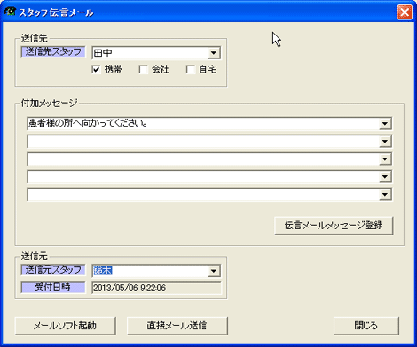 患者の住所からGoogleマップで地図を表示します。地図URLデータはスタッフの携帯電話にメール送信できるので、訪問診療の際に威力を発揮します。